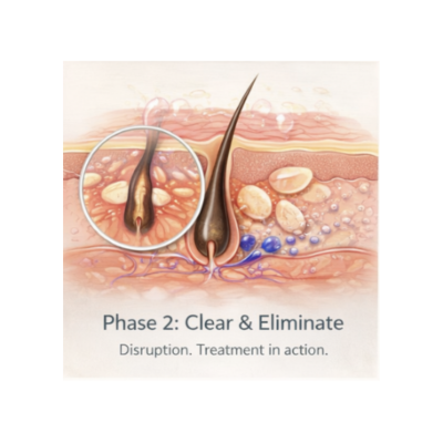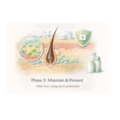 The program repeats targeted strategies across multiple mite life cycles while healing the skin and restoring microbiome balance — which is why 90 days gives reliable, lasting results.